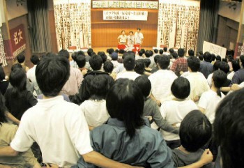 全学連は、九月十七日と十八日の両日、東京都内において全学連第七十四回定期全国大会を開催した。この場において全学連の学生たちは、奥野新委員長を先頭とする新たな中央執行委員会を確立したのだ。春・夏期の激烈な闘いをつうじて隊列をきたえあげてきた全学連の学生たちは、今大会においてそれらの闘いの意義と教訓をガッチリと確認した。これにふまえて、今秋期の∧イラク反戦・反安保・憲法改悪阻止∨の闘いの指針を確立したのだ。 |