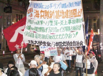 十月二日に沖縄の那覇市において「普天間基地の即時閉鎖と辺野古への移設反対を訴える県民大集会」(主催・基地の県内移設に反対する県民会議)が開催され、三五〇〇名の労働者・学生・住民が結集した。琉球大学・沖縄国際大学のたたかう学生たちは、東京からかけつけた早稲田大学の仲間たちとともに、<反安保>の旗高く奮闘した。 |