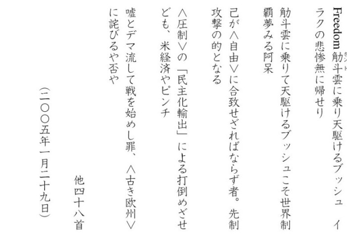 イラク反戦とともに改憲阻止リストラ反対の炎を! 2・11労働者怒りの総決起集会 第一基調報告(民間) 浜野耕蔵 本集会に結集された、すべてのたたかう皆さん! 私は民間重工業の職場で日々汗を流して働き、日本労働運動の変質を下から覆すためにたたかいぬいている仲間たちを代表して、第一基調報告を提起したいと思います。 去る一月三十日に、イラクでは、暫定国民議会選挙が、米軍占領下で強行された。「投票率六〇%」近くとなったこの選挙は、ブッシュ帝国の思惑に反して、反米・反占領の旗を掲げるシスターニ師配下の統一イラク同盟(シーア派)の圧勝をもたらした。これは、まさにアメリカの占領支配の完全な破産を刻印したものにほかならない。 今やイラクにおいては、シスターニ師配下のシーア派勢力とスンナ派とのすべての反米勢力が「多国籍軍の早期撤退」を共通のスローガンとして結束を固めつつある。反米・反占領闘争の最終的勝利に向けて闘いの火がイラク全土でますます燃えさかろうとしている。生命をかけてたたかっているこのイラクのムスリム人民と固く連帯して、われわれはここ日本の地で、反戦・反安保の火柱を噴きあげるとともに、〇五春闘の戦闘的高揚をかちとるために奮闘しようではないか! 以下、見出し T イラク反戦・憲法改悪反対の旗を高く掲げよ U 今日版産業報国運動に下支えされた政府・独占資本の大攻勢を粉砕せよ V 闘いの貴重な教訓を武器に前進しよう |