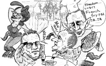 この「魅惑外交」の第一幕のヤマは、ライスのパリ訪問(二月八日)。フランス外相バルニエとの共同記者会見に臨んだライスが、バルニエを、猫なで声で「ミッシェル」とファーストネームで呼んだのに応じて、バルニエもまたライスを愛称で「コンディ」と呼ぶ、なんぞという、おぞましい演出がなされたのでありました。 |