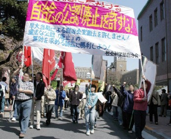社自公認『廃止』撤回闘争が高揚 早稲田大学のたたかう学生は、新入生を迎えた三月三十一日と四月一日の二日間にわたり、「社会科学部自治会の公認『廃止』決定(三月二日)撤回・自治会破壊粉砕」の闘争の一大高揚をきりひらいた。この闘いをつうじて早大生たちは、早大当局・社学当局による三月三十一日を期限とした自治会室の強制撤去を断固として粉砕したのだ。万余の新入生が参加する入学式会場に向けた二五〇名による大デモンストレーションに度肝を抜かれた当局は、いまなお社学自治会室に一歩も近づくことができないでいるのだ。 また社学自治会は、この闘いの一環として、公認「廃止」決定の無効を求め、当局を東京地裁に提訴した(三月二十三日)。これら縦横無尽の闘いのただなかで、わが闘いへの新入生の合流をもかちとり、自治会公認「廃止」決定そのものを覆すための橋頭堡を築いたのである。 |