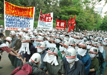 すべての労働者・学生・知識人諸君! この帝国主義支配階級の超反動的攻撃こそは、既成反対運動の見るも無残な惨状のゆえに許されている。かつて護憲・平和運動にまがりなりにもとりくんできた旧総評系諸労組とりわけ自治労や日教組の中央本部は、「連合」笹森指導部につき従って、いまや傘下の労組(員)を改憲翼賛の陣営にひきずりこむことに躍起になっている。日共・不破=志位指導部は、安保や自衛隊の是非を問わず「九条改悪反対の一点」での「国民的共同」をつくりだすために、憲法と自衛隊との「共存」や自衛隊の「平和的活用」という代案をおしだしてきた。この「護憲」ならぬ「護憲」方針=代案の犯罪性をわが革命的左翼が断固として暴きだしたことを決定的インパクトとして、下部党員・活動家の疑問・反逆が噴出している。この危機をのりきるために日共官僚どもは、「自衛隊の段階的解消」という党独自の方針を「広く明らかにしていく」などと金切り声をあげる(三中総)とともに、わが革命的左翼への憎悪を煽りたてているのだ。 すべての諸君! 吹き荒れる反動の嵐、改憲の大濁流を突き破り、〈国民投票法案の国会上程阻止〉〈改憲阻止・イラク反戦・安保同盟強化反対〉の一大闘争を決意も新たに創造しようではないか。 国民投票法制定・改憲案策定への猛突進 〈米・日―中・韓〉角逐への転回 自治労・日教組本部の裏切りと日共官僚の動揺 わが同盟の批判に心臓を射貫かれた日共官僚 中・韓人民と連帯し〈改憲阻止・反戦反安保〉の奔流を 尼崎大惨事を引き起こしたJR西日本当局を弾劾せよ〔記事2面〕 5・3改憲阻止を訴える街頭情宣にたいする権力と右翼の暴力的破壊攻撃を弾劾せよ 〔2面に抗議声明〕 |
