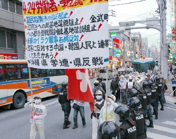4・24沖縄 那覇市街に「改憲阻止」の雄叫び 県学連・反戦が戦闘的デモ 外務省沖縄事務所に怒りの拳 四月二十四日、沖縄県学連と県反戦労働者委員会のたたかう労働者・学生は「憲法・教基法改悪阻止!」「米軍の再編強化反対!」を掲げて、労学統一行動に勇躍決起した。 |