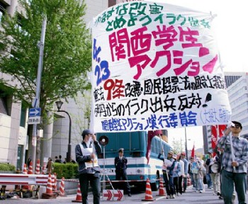 4・23関西学生アクション 米総領事館(左側)前で奮闘 四月二十三日、関西のたたかう学生は大阪経済大学・奈良女子大学・神戸大学の自治会・自治団体代表のよびかけのもとに「ゆるすな改憲! とめようイラク派兵! 4・23関西学生アクション」に起ちあがった |