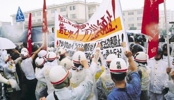 沖縄集会 反戦・反改憲の闘志新た 「こじ開け精神を発揮するぞ!」改憲阻止へ不退転の決意(8・7、宜野湾市) 八月七日、集会実行委員会の主催のもとにわが同盟沖縄県委員会と沖縄県反戦労働者委員会・沖縄県学連は、第四十三回国際反戦沖縄集会を宜野湾市社会福祉センターにおいて実現した。全国の仲間と連帯し、改憲の大濁流を打ち砕く橋頭堡を構築したのである。 |