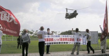 自衛隊ヘリに肉迫して闘う(9月2日、名護市21世紀の森公園) |