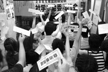 早稲田大 闘う社学自治会を再確立 当局による破壊攻撃を打ち砕く 七月二十三日、たたかう早大生の奮闘のもとに、社会科学部自治会の二〇〇五年度前期自治委員総会が開催された。結集した新自治委員たちは、新たな執行部体制を確立するとともに、〈改憲阻止!社学自治会の公認「廃止」決定を撤回させよう!〉をメインスローガンとする方針を全会一致で採択した。また社学自治委員総会に先立つ七月五日には、多くの文連加盟サークルの参加のもとに、文連総会が開催され、活発な討論をつうじて〈早大当局による文連組織破壊を許すな! 改憲阻止!〉の〇五年度後期方針が全会一致で採択された。 |