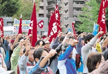 決意に燃えスクラム固く戦闘的にデモ(10・22、熊本) |