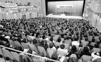 | 一月二十三日、名古屋大学、愛知大学、岐阜経済大学のたたかう学生は自民党愛知県連前に登場し、小泉政権による改憲・安保強化の策動を絶対に許さない決意をシュプレヒコールで叩きつけた。 |