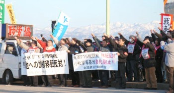 一月二十九日、石川県平和運動センターは「米空軍F15戦闘機の小松基地への訓練移転反対! 総決起集会」を小松現地で開催した。平和運動センターに結集する労働者ばかりではなく、県下各地の「九条の会」をはじめとする護憲団体の市民や金沢大学のたたかう学生も総結集し、訓練移転阻止の小松市街デモンストレーションを展開し、さらに小松基地ゲート前での抗議行動をくりひろげた。 |