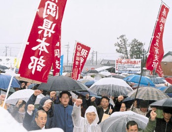 三月十九日、佐賀市役所南公園において、「『プルサーマル計画』受け入れ反対全国集会」が「佐賀県平和運動センター」「原水禁九州ブロック連絡会議」「フォーラム平和・人権・環境」三団体の共催のもとに開催された。 佐賀県知事・古川康が、県議会閉会後の三月二十二日にもプルサーマル計画への正式同意を表明しようとしていたことにたいして、これをなんとしても阻止するという気概に燃えて、佐賀県を中心にして九州各県、全国各地から一二〇〇名の労組員、市民が結集した。わが同盟は、彼らと固く連帯し、既成指導部の「安全性」論議への陥没を批判しつつ、<核開発を狙う核燃料サイクル計画反対>を鮮明にしてたたかうべきことを力強く訴えてたたかいぬいたのである。プルサーマル計画に同意した県知事・古川を弾劾する労働者・市民(3・19、佐賀市) |