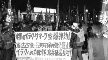 三月十七日、大阪・扇町公園において、「イラク開戦3周年抗議 自衛隊のイラクからの撤退 在日米軍基地再編・強化反対! 3・17大阪集会」(大阪平和人権センター・しないさせない戦争協力関西ネットワーク共催)が、三〇〇〇名を結集して開催された。おりしも前日の十六日にブッシュ帝国は、イラク・サマーラにおいて、ムスリム武装勢力にたいする掃討作戦を大々的に開始した。わが同盟とそのもとに結集する革命的労働者・学生は、この蛮行を徹底的に弾劾し、集会を戦闘的に高揚させるために奮闘したのだ。「安保強化反対!」を労働者に訴える学生(3・17、大阪・扇町公園) |