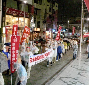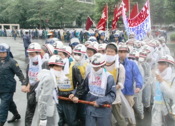 五月二十五日に那覇市与儀公園において、「県民意思を踏みにじる米軍再編日米合意糾弾! 辺野古新基地建設を押しつける小泉首相来県に抗議する5・25緊急県民大会」(基地の県内移設に反対する県民会議主催)が開催された。一二〇〇名の労働者・学生・市民が激しい雨をついて結集し、米軍新基地建設に突進し、改憲・国民投票法案などの極悪反動法制定を策す小泉政権にたいする怒りを爆発させたのだ。緊急県民大会に結集した労働者・学生(5・25、那覇) | |