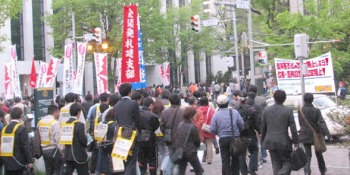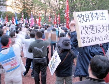五月二十三日、札幌大通公園において、「連合北海道」の主催で「教育基本法改悪反対全道集会」が開催された。デモ出発時に大横断幕の檄 | |