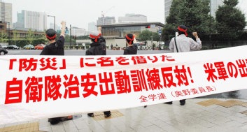 九月一日、小泉政府およびその意をうけた東京都などの八都県市当局は、自衛隊に加えて史上初めて在日米軍を投入して「総合防災訓練」なるものを強行しようとしていた。「防災」に名を借りて、ついに、首都・東京の治安出動訓練に米軍が参加しようというのだ。「戦争をやれる国」にふさわしい国家総動員体制を構築するためのこの「防災訓練」を断固として粉砕するために、全学連の学生たちは、訓練の総本部≠なす緊急災害対策本部が設置された首相官邸の前において、緊急抗議闘争に勇躍決起した。 |