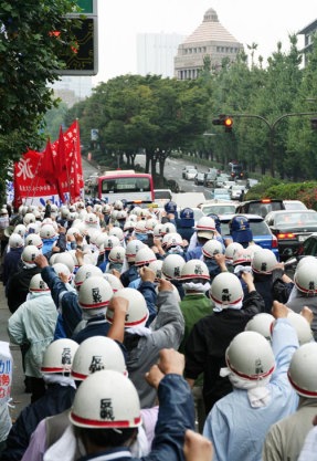 国家倒壊の危機に直面した金正日政権が、ブッシュ帝国からの「体制保証」獲得のための窮余の策として強行した地下核実験。これにたいして米日両権力者は、中・露両権力者を抱きこむことをつうじて、国連安保理において対北朝鮮制裁決議一七一八号の採択にこぎつけた。この安保理決議を「アメリカ政府の宣戦布告」と断じ、米日の強硬策にさらなる核実験の強行でもって応える構えを崩していない金正日の北朝鮮にたいして、米日両権力者は安保理決議を錦の御旗として、対北朝鮮の「臨検」=戦時経済封鎖へと猪突猛進している。米日両国軍は十一月にも、日本海において米第七艦隊と海上自衛隊との合同軍事演習を、それじしん臨検のための軍事作戦の一環として強行しようとしている。 安倍政権は、現行憲法を公然とふみやぶるかたちにおいて、戦後はじめて日本国軍による対北朝鮮の日米両軍共同の軍事行動にふみだそうとしているのである。こうして、東アジアにおいて戦乱勃発の危機が刻一刻と高まっている。 だが、この戦争前夜というべき情勢のまっただなかにおいて、日共の不破=志位指導部の対応といったらどうだ! 国連安保理決議の採択を「歓迎」し、米日両権力者による対北朝鮮制裁を尻押ししているありさまではないか。まさにこの日共中央のもとで、既成平和運動は「制裁」翼賛運動というべきものに堕しているのだ。 この度し難い腐敗をのりこえるかたちにおいて、戦闘的労働者・学生は、東アジア戦乱の危機を突き破る反戦闘争の炎を首都中枢に赤々と燃えあがらせた。同日、北海道、東海、関西において起ちあがった労学と固く連帯し、まさに全国いっせいに<反戦反安保・ネオファシズム的反動化阻止>の雄たけびをとどろかせたのだ。 <米中新対決>下の戦乱的危機を突き破れ!