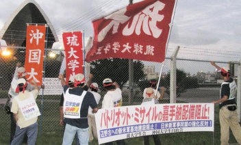 十月二日、沖縄平和運動センターと中部地区労が主催する「パトリオット配備阻止! 緊急抗議集会」が、嘉手納基地第一ゲート前(北谷町・砂辺)で開催された。沖縄のたたかう労働者・学生たちは、在沖米軍基地へのPAC3配備を断固として阻止する闘いのさらなる高揚のために、日夜奮闘しているのだ。 |