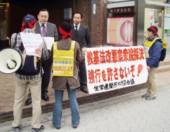 教基法改定案の参院採決を阻止せよ 既成指導部の「慎重審議要求」運動の破産をのりこえて闘おう 日本版ネオコン安倍政権は、いま教基法改定案の採決を一気に強行しようとしている。十二月七日には参院同法特別委員会において採決を、翌八日には参院本会議において可決=成立をなしとげることを企んでいる。十二月四日の全国四ヵ所での地方公聴会の開催を全野党が認めたことによって、教基法改定案の可決=成立の政治日程が一挙に確定したのだ。 衆院において安倍政権との「対決」=採決拒否という姿勢をとってきた民主党・小沢執行部は、沖縄知事選での敗北を契機として党内タカ派から噴出した不満・反発を抑えきれず、この「対決主義」的対応をなしくずし的に放棄し参院での審議に応じている。小沢民主党にぶらさがって「慎重審議」を要求してきた日共中央や社民党中央も、今なお小沢民主党につき従っているのだ。許しがたいことに、防衛庁の「省」への昇格と自衛隊の海外派遣を「付随的任務」から「本来任務」にひきあげる「防衛省」法案、この極反動法案が自民・公明・民主の賛成(日共、社民は反対)によって一気に可決されたのだ(十一月三十日)。 小沢民主党中心の四野党共闘に依存してきた日教組本部・全教本部のダラ幹どもは、いまや完全に腰くだけとなり、安倍政権の教基法改悪の策動に完全にのみこまれているではないか。ネオ・ファシストどもによる教員バッシングに縮みあがった日教組本部は、多くの下部組合員の声をふみにじって、国会前座りこみ闘争から退散した。全教本部は「いじめ」問題の対応に終始して組合員を教育実践にかりたてている始末なのだ。 こうした危機的状況の中で、わが同盟とその旗のもとにたたかう戦闘的労働者たち、とりわけ教育労働者たちは、各県教組本部を下から突きあげつつ、教基法改悪絶対阻止の闘いの高揚のために奮闘している。これと連帯しつつ全産別の労働者たちが、ダラ幹どもの抑圧をはねのけて、またたたかう学生たちが各学園から国会にむけて参院可決=成立阻止の闘いを全力でたたかいぬいている。 すべてのたたかう労働者・学生たちは、小沢民主党に依存した既成反対運動指導部の「慎重審議要求」運動の破産をのりこえて、教基法の改悪を絶対阻止せよ! <憲法改悪阻止! 対北朝鮮臨戦態勢の恒常化=強化反対! 日米新軍事同盟の強化反対!>を高だかと掲げてたたかおう! 以下、見出し 小沢民主党の腰砕けの下で一気に法案成立を策す政府 安倍式ネオ・ファシズム的教育改革への突進 小沢民主党依存の「慎重審議要求」運動の全面破産 反対運動の危機を根底から突き破り前進せよ! |