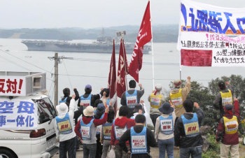 「米イージス艦寄港阻止!」 「ハルゼー」を迎え撃つ鹿大生(11月2日、鹿児島谷山港)) |