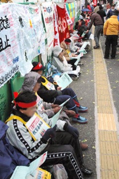 連日、座り込みを貫徹する教育労働者と学生・市民ら (12月8日) |