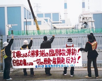 三月二十四日、金沢大学のたたかう学生は、北陸電力が一九九九年にひき起こし・八年間にわたって隠ぺいしつづけてきた志賀原発1号機臨界事故を弾劾する志賀現地闘争に勇躍決起した。 |
