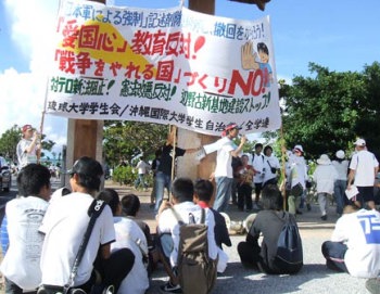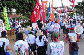 「政治色の排除」の名のもとに、この県民大会の基調をば教科書に「軍の関与」の記述を「回復」することを政府・文科省にお願いするものへと収斂しようとした自民党沖縄県連および民主党・「連合沖縄」指導部と、これに迎合した日共党官僚。彼らのこの画策に抗して、わが革命的左翼は、日本国家を「アメリカとともに戦争をやれる国」へと飛躍させるための福田政権の策動に反対する一大闘争へとこの運動を高揚させるために、県民大会の組織化過程においても会場そのものにおいても、終始奮闘しぬいたのである。まさしくわが革命的左翼の奮闘によって、9・29県民大会は、自民党沖縄県連はもちろん、いっさいの野党諸党の党利党略と政治的思惑をはるかに超えるかたちにおいて、全沖縄労働者・人民の激しい怒りが総集結し燃えさかる場と化したのである。 |