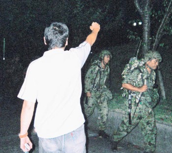 九月二十六日、陸上自衛隊は、金沢大学キャンパス内を貫く県道二十七号線において、何らの予告もなく夜間行軍訓練を強行した。これにたいして、金沢大学教養教育学生自治会のたたかう学生たちは緊急抗議闘争に決起した。 |