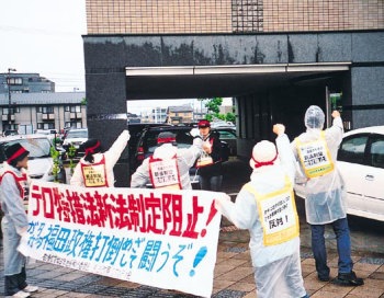 十月十九日、金沢大学教養教育学生自治会のたたかう学生たちは、「『新テロ特措法』制定阻止!」を掲げ、自民党石川県連前での抗議闘争に勇躍決起した。 |