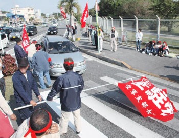 沖縄県では米軍基地ゲート前三十九ヵ所でピケを張り、全体比約六四%にのぼる三四九五人が決起した。(沖縄県外では東京・青森・長崎など一都五県で五五〇〇人がストに決起した。) 最大拠点の嘉手納第一ゲート前には、「連合沖縄」傘下の自治労・JP労・国公労などの組合員に加え、全駐労OBも連れ立って支援にかけつけ、六〇〇人余の結集のもとに怒りの決起集会がかちとられた。 防衛相・石破の「賃金水準の低い沖縄では全駐労の給与は相対的に高い」という前日の発言が報告されるや、労働者たちは怒り心頭に発し、そこかしこで次々と石破弾劾の声を噴きあげた。「たしかに沖縄の民間労働者の賃金は全国比で最下位だ。それもダントツに低い。最低の賃金と比較して高いから賃金カットするとは言語道断!」「誰が最低の所得水準にしたんだ。広大な土地を銃剣で奪って基地を建設したのは誰だ!」と。 まさにしかり。そもそも、沖縄の低賃金・雇用難は、いわゆる基地依存経済という奇形的な産業・経済構造に根ざしたものなのだ。そのことを無視した石破の発言は、あまりにも無節操・無責任であり、傲慢そのものではないか。 連帯挨拶に立った国公労の労働者は、「守屋などの防衛省官僚は防衛費を食い物にしていながら、米軍再編費用を捻出するために駐留軍労働者の賃金を削減しようとしている。こんなでたらめなことを許すわけにはいかない!」と弾劾する。力強い連帯挨拶に結集した労働者は大きな拍手を送る。「石破発言弾劾!」の怒りのシュプレヒコールは熱気を帯びる。「団結固く要求貫徹までたたかうぞ!」「連続ストでたたかうぞ!」 |