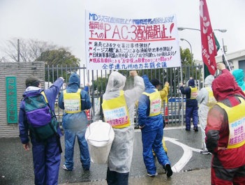 三月二十三日に、「平和・人権・環境福岡県フォーラム」などが主催して「終わらせようイラク占領、撤退させよう自衛隊! パトリオット・ミサイル配備反対 福岡県集会」が、航空自衛隊西部航空方面隊司令部(第二高射群司令部)のある春日現地で開催された。二〇一〇年度に福岡の三つの自衛隊基地(築城・芦屋・高良台)に四基のPAC3ミサイル配備が計画されていることに抗議して、この三基地を指揮するとされる春日基地のある現地で集会・デモが実施されたのである。 |