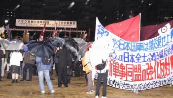 三月十九日、大阪市北区の扇町公園において「イラク開戦五周年抗議、在日米軍再編強化反対、米兵の少女暴行事件抗議、沖縄教科書検定撤回! 3・19大阪集会」(大阪平和人権センターと「しない・させない戦争協力関西ネットワーク」の共催)が開催された。神戸大学や奈良女子大学をはじめとする関西のたたかう学生は、結集した三五〇〇名の労働者・市民と連帯して、闘いを戦闘的に高揚させるために奮闘した。 |
