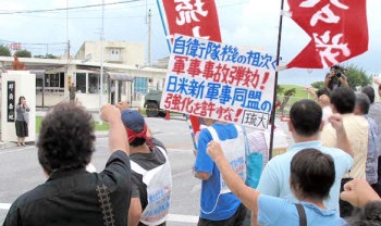空自那覇基地ゲート前で労学がシュプレヒコール (9月16日) |