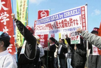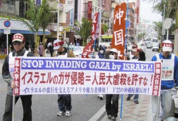 一月十二日、琉球大学と沖縄国際大学のたたかう学生たちは、那覇市においてイスラエルのオルメルト=リブニ政権下のイスラエル国家によるガザ軍事侵略に反対する「怒りの学生マーチ」に起ちあがった。国際通りでのデモ行進(1・12、那覇) |