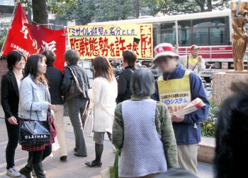 わが同盟九州地方委員会は、四月四日と五日に、福岡市天神において、米日両政権による対北朝鮮臨戦態勢への突入、MDシステムの実戦配備・発動を弾劾する大情宣をおこなった。 |