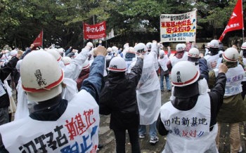 | 一月三十一日、沖縄県学連の学生と県反戦労働者委員会の労働者は、辺野古への新基地建設に反対する候補が当選した名護市長選挙の結果を「斟酌(しんしゃく)する理由はない」(官房長官・平野)などと言い放ち辺野古新基地建設を強行するハラのうちをあらわにした鳩山政権を弾劾し、労働者・人民へのいっそうの貧困強制にたいする怒りに燃えて、労学統一行動に勇躍決起した。 | |