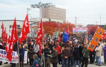 | 十一月六日、千歳市内で、「連合北海道」と北海道平和運動フォーラムとが共催で、「米空軍戦闘機千歳基地訓練移転反対全道集会」を開催した。「連合北海道」傘下の労働者や市民七〇〇名が結集し、八日からの訓練開始を阻止すべく集会とデモ行進をおこなった。 | |