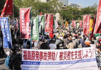 | 四月二十四日に、「くり返すな! 原発震災 つくろう! 脱原発社会 4・24集会」が東京・芝公園二十三号地で開かれた。原子力資料情報室、日本消費者連盟、たんぽぽ舎、プルトニウムなんていらないよ! 東京、大地を守る会などの市民団体でつくる「原発とめよう! 東京ネットワーク」が主催したこの日の集会とデモには、四五〇〇人にのぼる労働者や学生そして市民が参加した。たたかう労働者や「首都圏学生ネット」の学生は、それぞれの職場・学園で創意工夫をこらした闘いをつくりだし多くの組合員や自治会員とともにこの場に結集した。 | |
