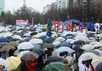 | 4・29〜5・1北海道 五月一日、札幌市大通り西八丁目広場で開催された「連合北海道」主催のメーデーには、雨がふる悪天候にもかかわらず、実に五〇〇〇人(主催者発表)もの労働者が参加した。「原発事故弾劾」の声を抑圧する労働貴族を弾劾し「人民を放射線被曝にさらしつづける菅政権を許すな!」の声あがる。 |