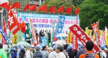 5・1名古屋 五月一日、「全労連」傘下の「愛労連」が主催する第八十二回愛知県中央メーデーが名古屋市の白川公園で開催され、名古屋市職労・愛高教・全港湾・医労連などの組合員をはじめとして四〇〇〇名(主催者発表)の労働者・市民が結集した。「東日本大震災の救援・復興に力を合わせよう」というメインスローガンを掲げたこの「愛労連」メーデー集会を、<浜岡原発を止めよう! 被災人民支援!>の総決起の場として戦闘的に塗りかえるために、わが革命的・戦闘的労働者たちは、職場での取り組みを基礎にして創意工夫した闘いをくりひろげた。わが同盟の情宣隊もこれに呼応するかたちで奮闘したのだ。 |
