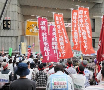 | 六月二十四日、東京・日比谷野外音楽堂において、「くり返すな! 原発震災 つくろう! 脱原発社会 6・24集会とデモ」が開催された。原水爆禁止日本国民会議、原子力資料情報室などが呼びかけ団体となったこの集会・デモには、約四五〇名の労働者・市民・学生が結集し、「原発とめろ!」の怒りの声をあげた。 経済産業相・海江田は六月十八日、各自治体に定期点検中の原発の再稼働を要請した。原子力安全・保安院がわずか二日間でアリバイ的な「安全点検」をおこなったことをもって「安全宣言」を発した菅政権は、これをタテに、玄海原発2・3号機を皮切りにして全国の停止中の原発を次々に再稼働させようとしているのだ。 このきわめて緊迫した局面において本6・24集会は開催された。たたかう労働者の各職場における奮闘によって多くの労組員たちが集会に結集した。「首都圏学生ネット」のたたかう学生たちは、「原発再稼働阻止!」「すべての原発を停止し廃棄せよ!」「日米新軍事同盟の強化反対!」「被災人民見殺しの菅政権を打倒しよう!」と参加者に力強く訴えながら、集会・デモを先頭で牽引したのだ。 |