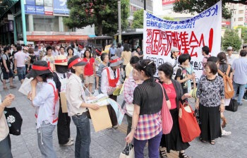 | 三月以来「試験運転」という名においてフル稼働を続けている泊原発3号機の営業運転を阻止するために、七月二十四日、「Shut泊」などの市民団体がデモ行進にとりくんだ。まさに今、震災後、全国の原発のなかで初の営業運転再開を許すのか否かが問われているのだ。「原発とめろ! 北海道学生連帯会議」の北海道大学、帯広畜産大学、旭川教育大学の学生は、このデモにおいて「すべての原発をただちにとめろ!」というスローガンをも掲げて原発反対闘争の高揚のために奮闘した。 |