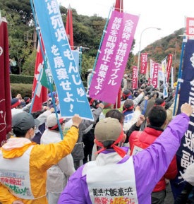| 十二月三日、「原子力発電に反対する福井県民会議」など五団体の呼びかけのもとに、「二〇一一もんじゅを廃炉へ! 全国集会」が福井県敦賀現地において開催された。この集会は、東京電力・福島第一原発事故が勃発した3・11以降初めての敦賀現地での集会であり、野田政権が原発再稼働を虎視眈々と狙っているそのまっただなかで実現された。チェルノブイリ原発事故を上回る未曽有の核惨事を引き起こした政府・電力資本にたいする怒りに燃え、例年を大きく上回る一三〇〇名もの労働者・市民がこの集会に結集した。 「許すな原発・核開発! 阻止せよ軍事大国化! 全国学生連帯会議」のたたかう学生たちは、野田政権による核燃料サイクル確立の策動を打ち砕き、原発再稼働を絶対に阻止するという決意のもとに、全国から敦賀現地に結集した。彼らは、「高速増殖炉『もんじゅ』を廃棄せよ! 核燃料サイクルの確立反対!原発再稼働絶対阻止! 原発輸出反対! すべての原発を即時停止し廃棄せよ!」を高々と掲げ、この日の闘いの戦闘的高揚をかちとるために奮闘したのである。 |