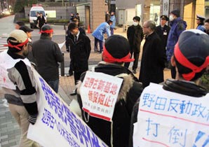 | アメリカ・オバマ政権に「年内に結果を出せ」と尻を叩かれた野田政権は、辺野古に米海兵隊の新基地を建設するための環境影響評価書をなんとしても年内に沖縄県当局に提出しようと狂奔した。かの前沖縄防衛局長の侮蔑発言(「犯す前にこれから犯すと言うか」)に怒りに燃えた沖縄の労働者・学生・市民は、これを阻止するために、断固として12月26日から28日にかけて連続決起した。 | |