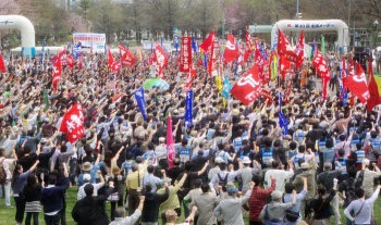 五月一日、文字通りの五月晴れのもと、「連合北海道」主催のメーデーが北海道各地で総勢八万人の組合員の参加のもとに開催され、札幌集会には五〇〇〇人が結集した。 大通西8丁目広場 |