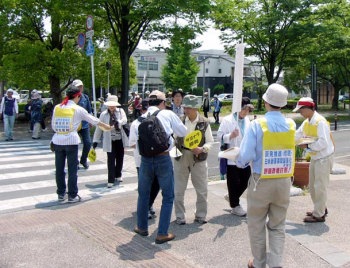 佐賀集会 5・27 「GOODBYE NUKES さよなら原発! 核なき未来は今、ここから 佐賀集会」が、日共系諸団体と市民団体とによる実行委員会の主催で、佐賀市・「どんどんどんの森」において開催された。わが同盟情宣隊は、再稼働を絶対に許さない決意に燃えて「エネルギーの安定供給」の土俵にはまりこんだ「再生可能エネルギーへの転換」要求運動をのりこえ、<原発再稼働阻止! 全原発・核施設を廃棄せよ!>と結集した労組員や市民に呼びかける大情宣を展開した。 |