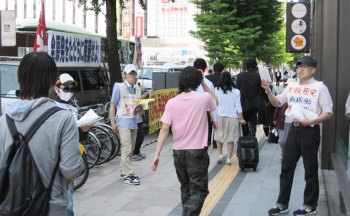 北大生が情宣 6・8 札幌 六月八日、北海道大学農学部学生自治会のたたかう学生たちは、大飯原発の再稼働を阻止するべきことを訴える札幌駅前緊急街頭情宣をおこなった。 |
