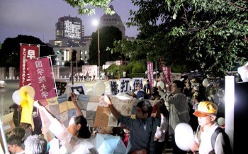 | 七月二十日、首相官邸・国会正門前に「原発再稼働反対!」の怒りの声が轟きわたった。この日、雨をついて九万人(主催者発表)の労働者・市民が抗議行動に結集した。全学連のたたかう学生は国会正門前において、結集した人民に、原発再稼働に突き進む野田政権を打倒するべきことを呼びかけつつ、抗議行動を最先頭で戦闘的に牽引した。 | |