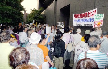 | 七月二十日の金曜日、この日も大阪市北区・中之島の関西電力本店前において、大飯原発3・4号機の再稼働を強行した野田政権・関電への怒りに燃えて、約一九〇〇人の労働者・人民が「再稼働反対!」の声を轟かせた。神戸大学や奈良女子大学などのたたかう学生たちは、結集した労働者・人民の先頭で「すべての原発・核燃料サイクル施設を廃棄せよ!」「野田反動政権打倒!」の旗高く戦闘的にたたかいぬいた。 | |