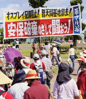 | 「オスプレイ配備阻止!」一〇万余の沖縄労働者・人民の怒りの炎が赤あかと燃えあがった。米・日両国権力者が九月下旬にも強行をたくらんでいる米海兵隊の新型垂直離着陸輸送機MV22オスプレイ普天間配備に反対して、「オスプレイ配備反対沖縄県民大会」(同実行委員会主催)が九月九日に宜野湾市海浜公園で開催され、一〇万余の労働者・学生・市民が米日両政府に怒りの拳を上げた。 わが同盟とともにたたかう革命的・戦闘的労働者・学生は、この日の闘いを日米新軍事同盟の対中国(対ロシア)攻守同盟としての強化に反対する<反安保>の闘いとして戦闘的に高揚させるために、終始全力でたたかいぬいた。 わが同盟は、「安保破棄めざしてたたかおう!」の革命的檄を発しつつ、日共・不破=志位指導部による「危険なオスプレイ配備反対」の「一点での共同」をシンボルとする「反安保」ぬきの運動をのりこえるかたちにおいて、この日の闘いを戦闘的にたたかいぬいたのである。 |