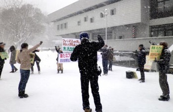 雪の北大キャンパスに戦闘的雄叫び (1月21日) |